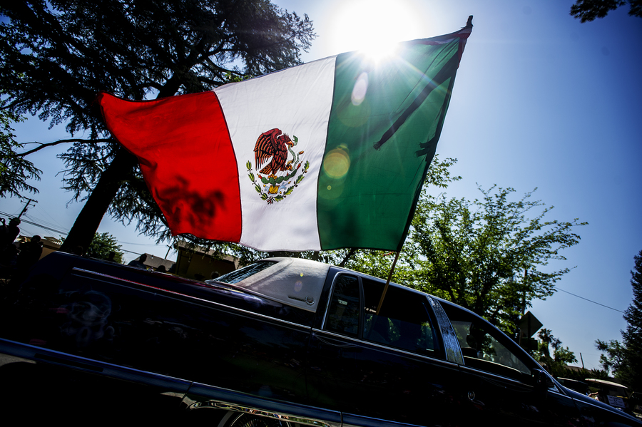 The flag of Mexico is flown out the window of a car during the annual Planada Community Day parade in Planada, Calif., Saturday, May 9, 2015.