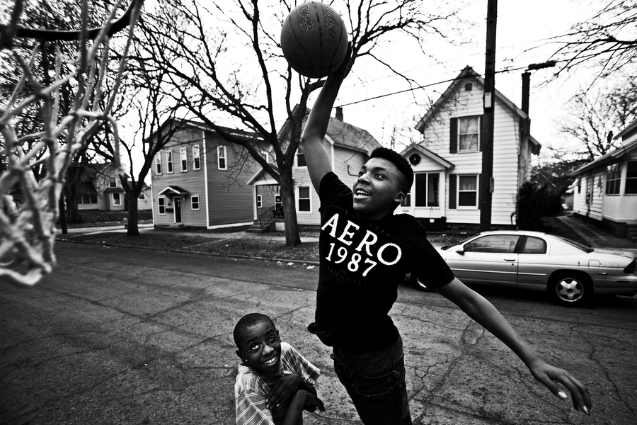 Jalen Thomas, 13, of Grand Rapids attempts to dunk over Craig Joiner,12, outside Joiner's home on Indiana Avenue SW in Grand Rapids, Mich., Thursday, April 10, 2014. (Andrew Kuhn | MLive.com)
