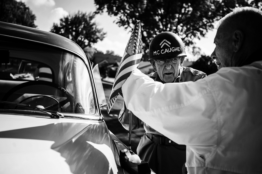 United States Army Medical Corps veteran Joe McCaughey, 87, of Merced, left, receives help from United States Air Force veteran and Atwater resident Gene Holiday, 83, right, in attaching an American flag to his 1952 Chevrolet before the start of the annual Veterans Day parade in downtown Merced, Calif., Wednesday, Nov. 11, 2015. Thousands lined Main Street to honor the men and women who have served their country.