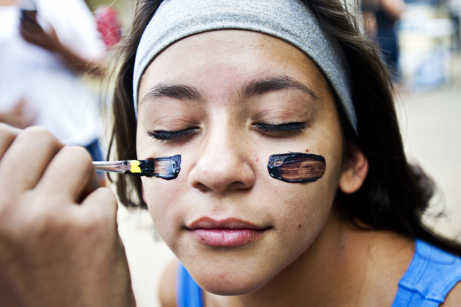 El Capitan sophomore Kaylin Gonzalaz receives help painting her face from fellow El Capitan sophomore Vannaleze Barcelos prior to the high school varsity football game between El Capitan and Buhach Colony at Stadium '76 at Merced College in Merced, Calif., on Friday, Aug. 28, 2014.