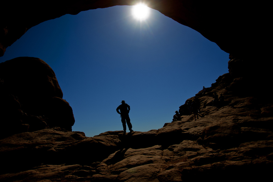 An Arches National Park visitor stands in the North Window Tuesday, June 12, 2012 in Moab, Utah. The Windows section of Arches National Park is one of the busiest areas of Arches which attracts over one million visitors a year. (Andrew Kuhn/National Parks Service)