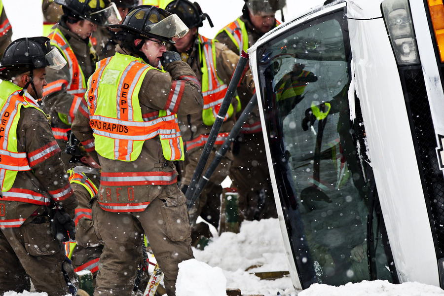 Grand Rapids police and fire crews close northbound U.S. 131 while extricating passengers in a single car rollover crash in the median near Ann Street NW in Grand Rapids on Sunday, February 16, 2014. (Andrew Kuhn | MLive.com)