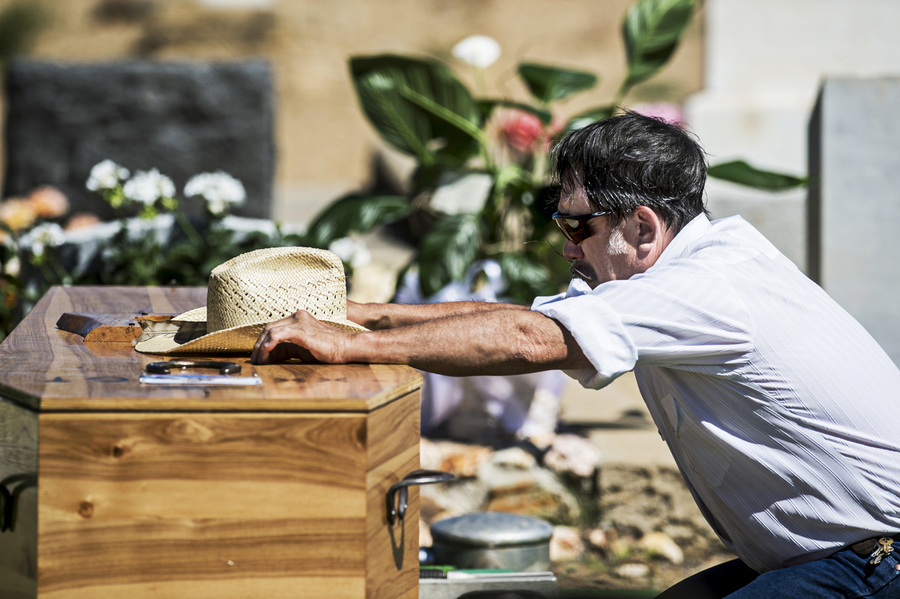 Dave Wood places his hands on the casket of brother Bob Wood of Empire, during a funeral for Bob Wood at Saint Catherine's Catholic church in Hornitos, Calif., Friday, March 27, 2015. Wood, who died Wednesday, March 25, 2015, was surrounded by friends and family as he was buried in a handmade casket lined with coyote fur and deerskin.