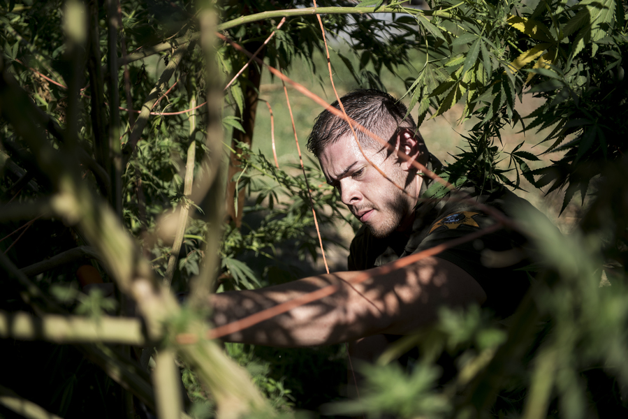 Merced County Sheriff's Deputy Ryan Mobley chops down marijuana plants after the sheriff's office served a search warrant at a farmhouse in the 10000 block of Bell Drive in Atwater, Calif., on Friday, Sept. 21, 2018. According to Sgt. Ray Framstad, the illegal cultivation operation consisted of over 200 marijuana plants.