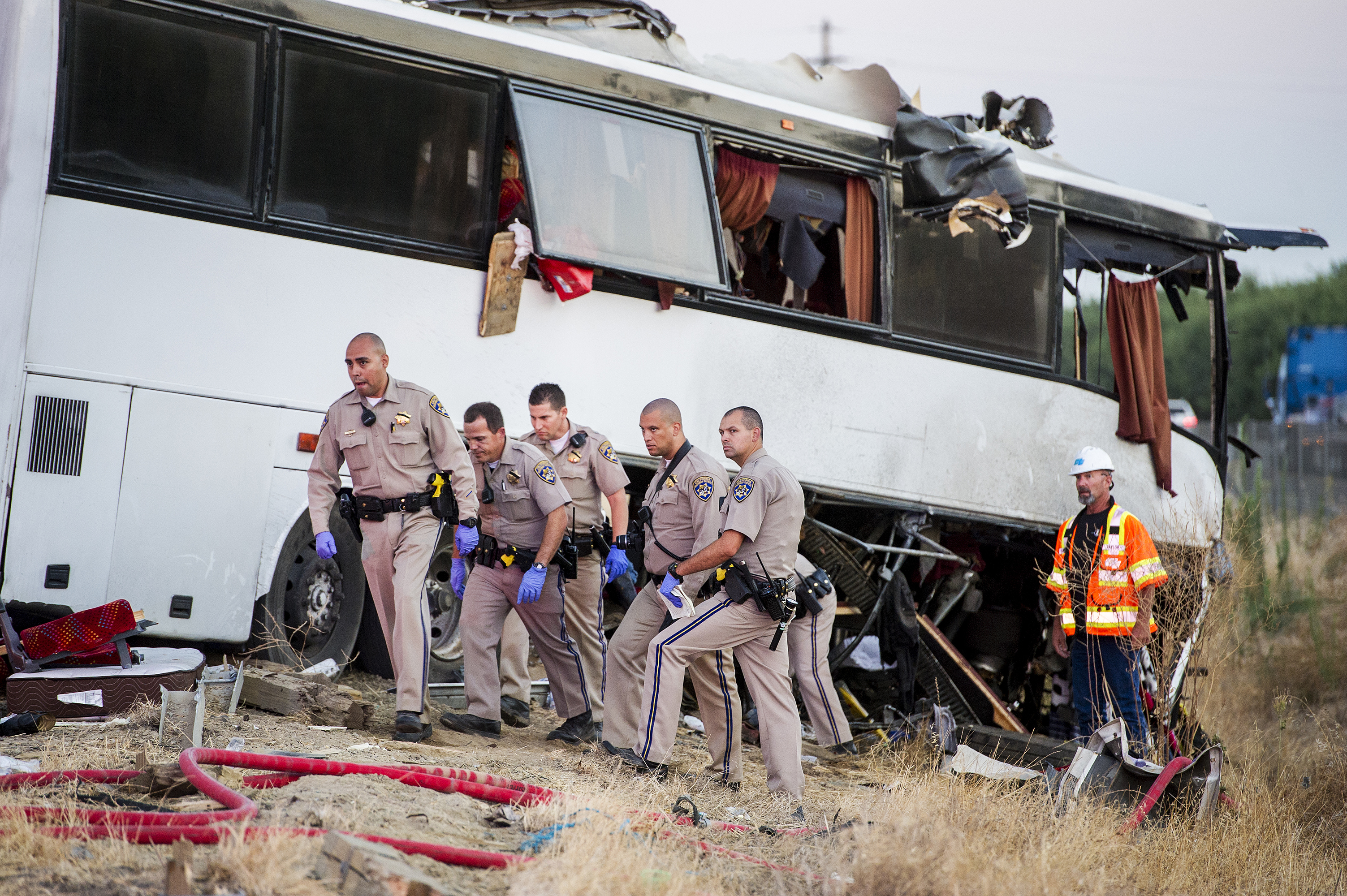 California Highway Patrol officers investigate the scene of a charter bus crash on northbound Highway 99 between Atwater and Livingston, Calif., Tuesday, Aug. 2, 2016. According to the California Highway Patrol, five people are dead and at least five more suffered major injuries when the bus carrying about 30 people struck a large pole holding the highway exit sign for Hammatt Avenue.