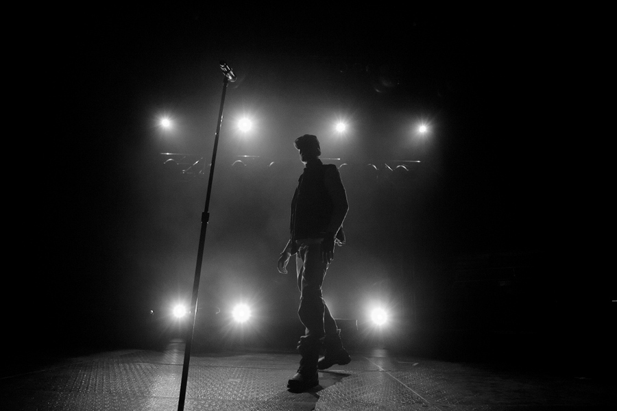 Hip hop recording artist B.o.B. walks onto the stage Friday night shortly before power is lost at McGuirk Arena in Mount Pleasant. After a short delay the power was restored and the show presented by the CMU Program Board, went on as planned. (Andrew Kuhn/Staff Photographer)