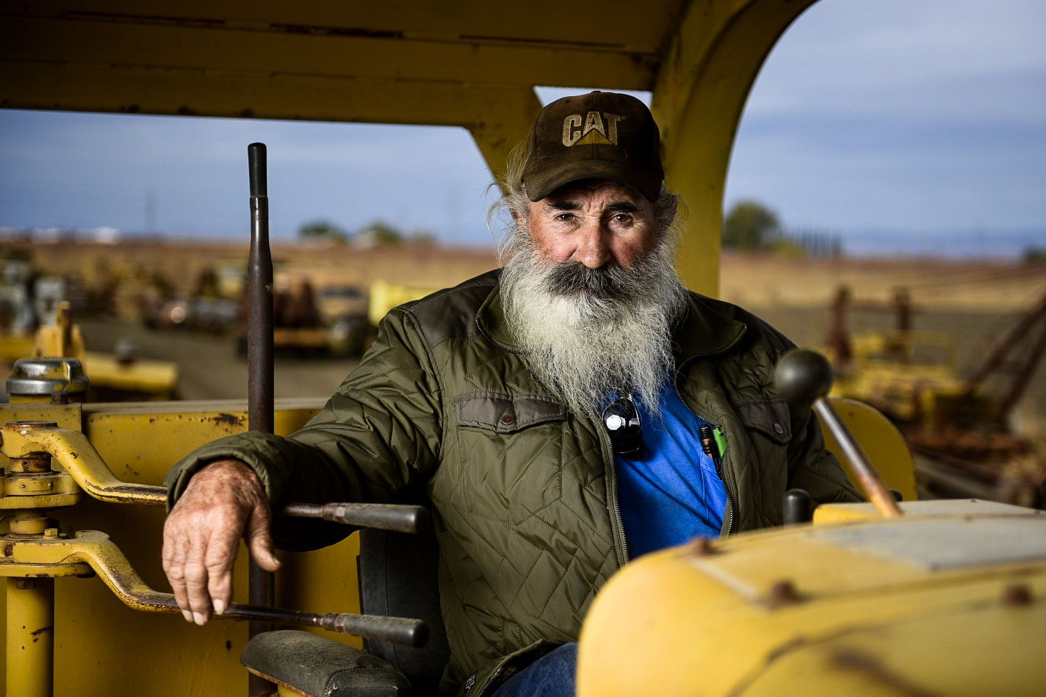 Gary Reinero, 83, sits on a piece of heavy machinery he uses to move earth for various jobs in Merced, Calif., on Thursday, Dec. 7, 2023.