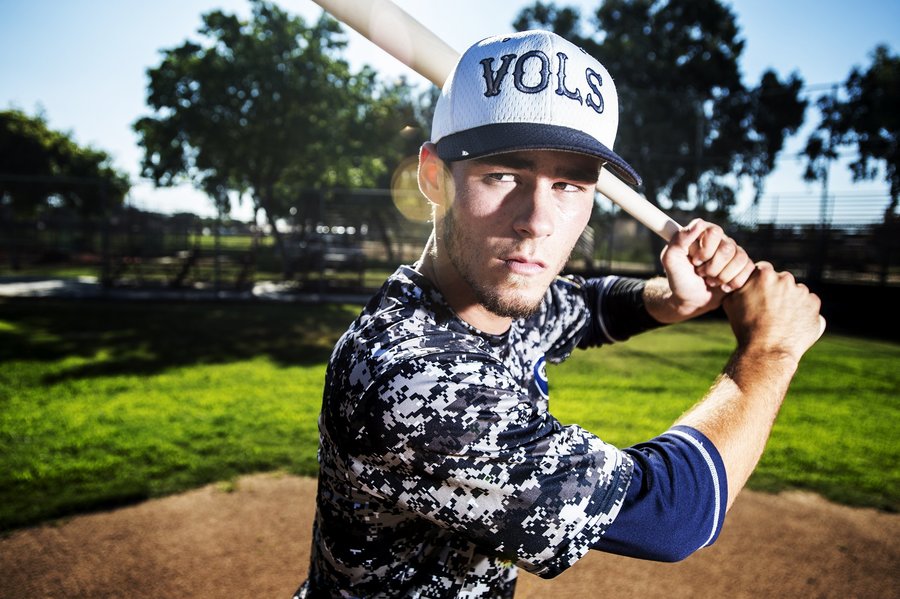 Merced High School senior Josh May poses for a portrait at the Merced High School baseball field in Merced, Calif., Tuesday, July 28, 2015. May, who is playing for the Merced Volunteers this summer, was sidelined last season after undergoing Tommy John surgery on his throwing arm.